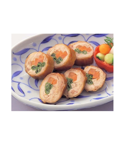 ・人参・いんげんを若鳥で巻き上げ、独自の和風の味付けでおいしく煮込んだ彩りのよい商品です。